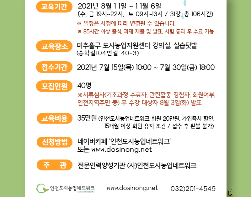 2025년 도시농업전문가양성과정은 3월 21일 ~ 7월 9일 까지 진행되었습니다. 이번 과정은 인천대학교 평생교육 트라이버시티와 협력하여 진행한 과정으로 진행되었습니다.