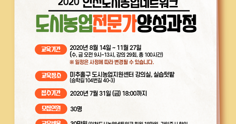 인천도시농업네트워크는 2014년 이후 자체적인 교육커리큘럼 개발과 교육내용을 정리하여 자체교재를 발간하였습니다. 2015년 부터 26회의 전문가과정 교육을 위탁(또는 공동주관)운영하였습니다.
